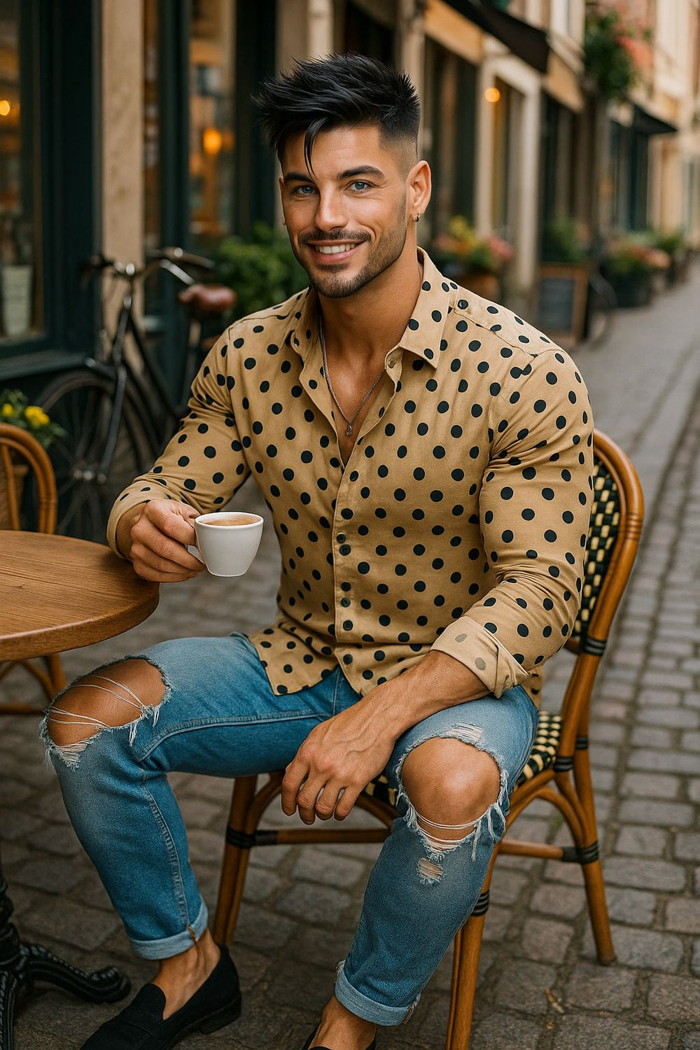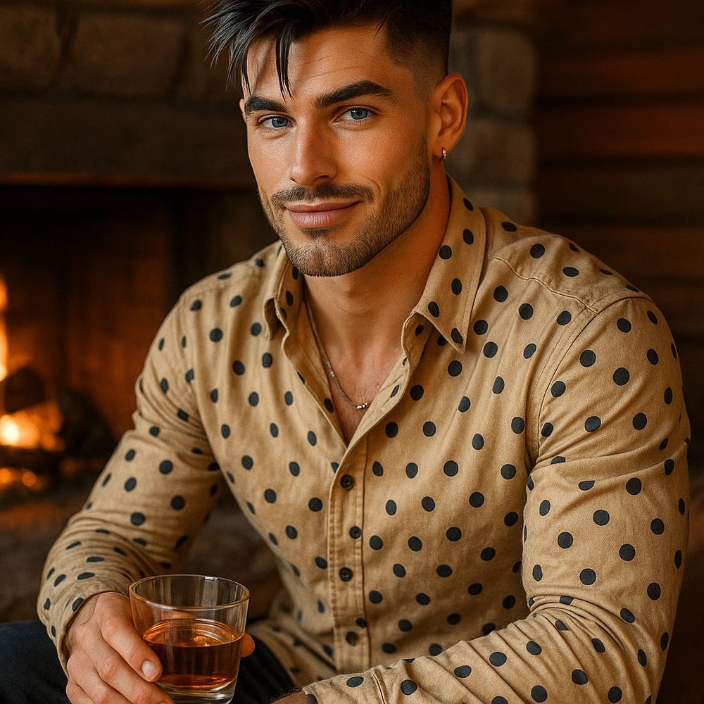 Add a playful twist to your wardrobe with this beige polka dot shirt for men, designed in a modern slim fit for a stylish and confident look. The classic beige base with bold black polka dots creates a timeless yet trendy vibe, making it perfect for casual outings, parties, or weekend hangouts.
