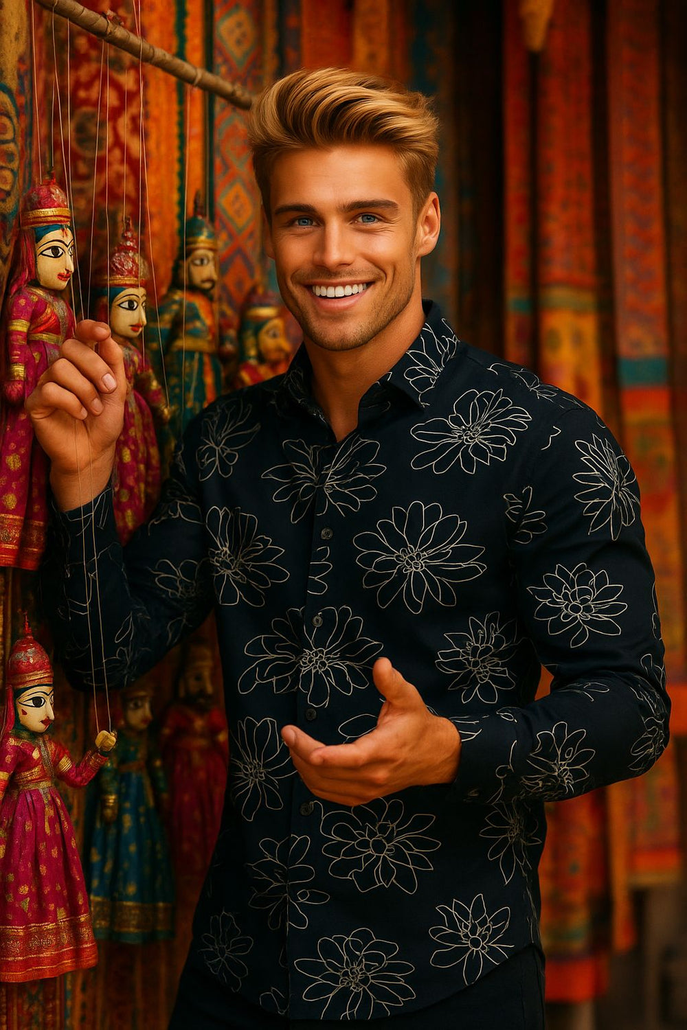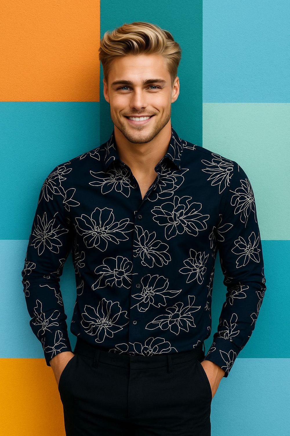 Turn heads with this black floral outline print shirt for men, designed in a sleek slim fit for the perfect balance of boldness and elegance. The deep black base with minimalist white floral sketches gives it a modern, artistic appeal that works for both casual outings and high-class parties.
