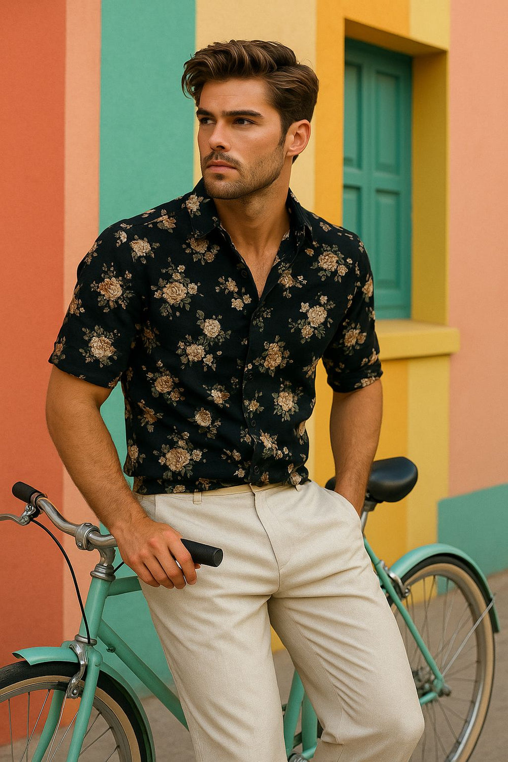 Black Floral Print Short Sleeve Shirt for Men | Premium Summer Party Wear