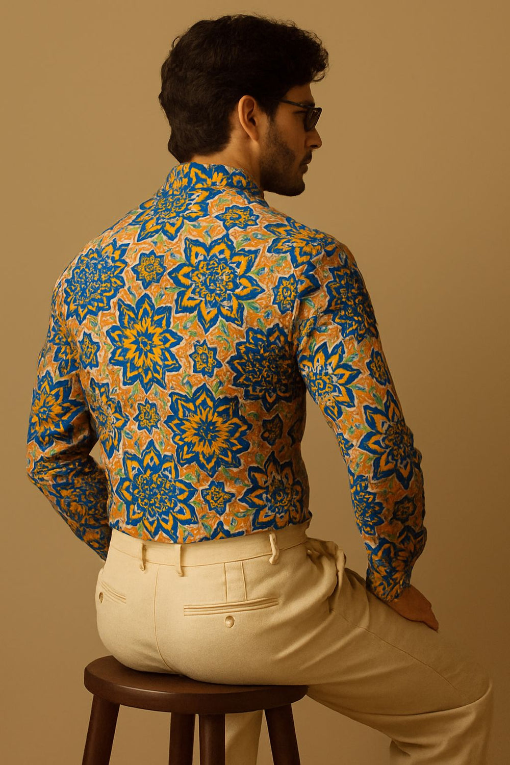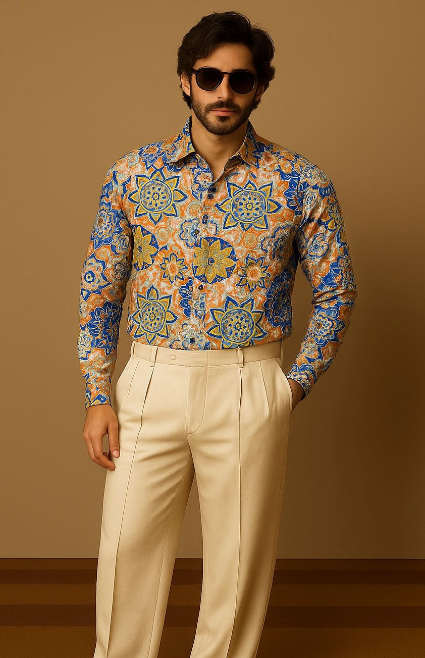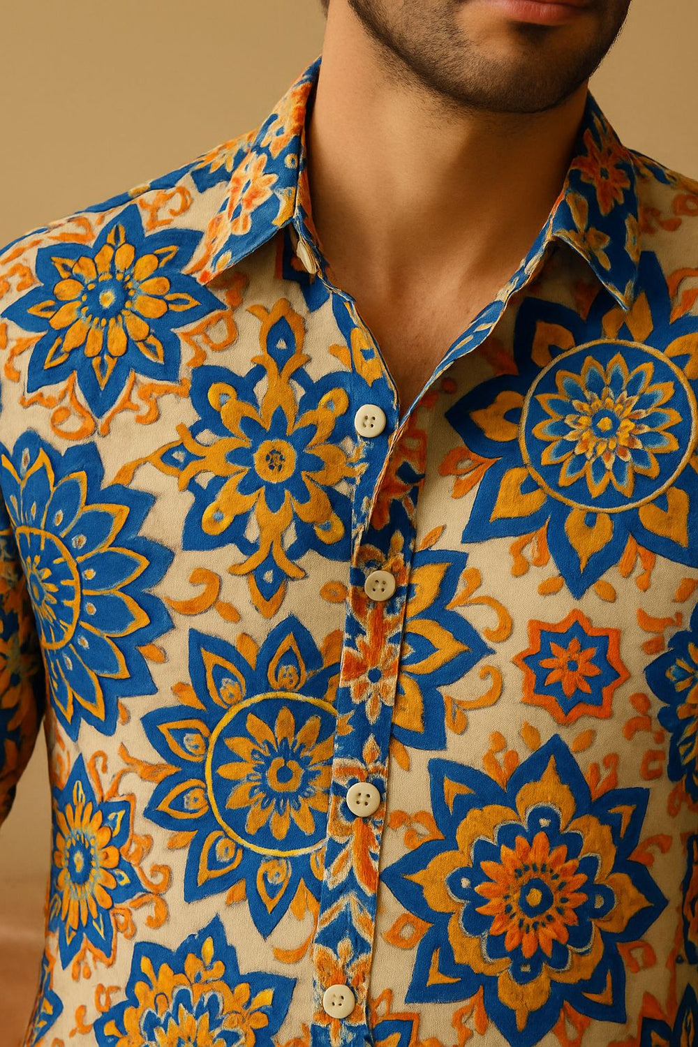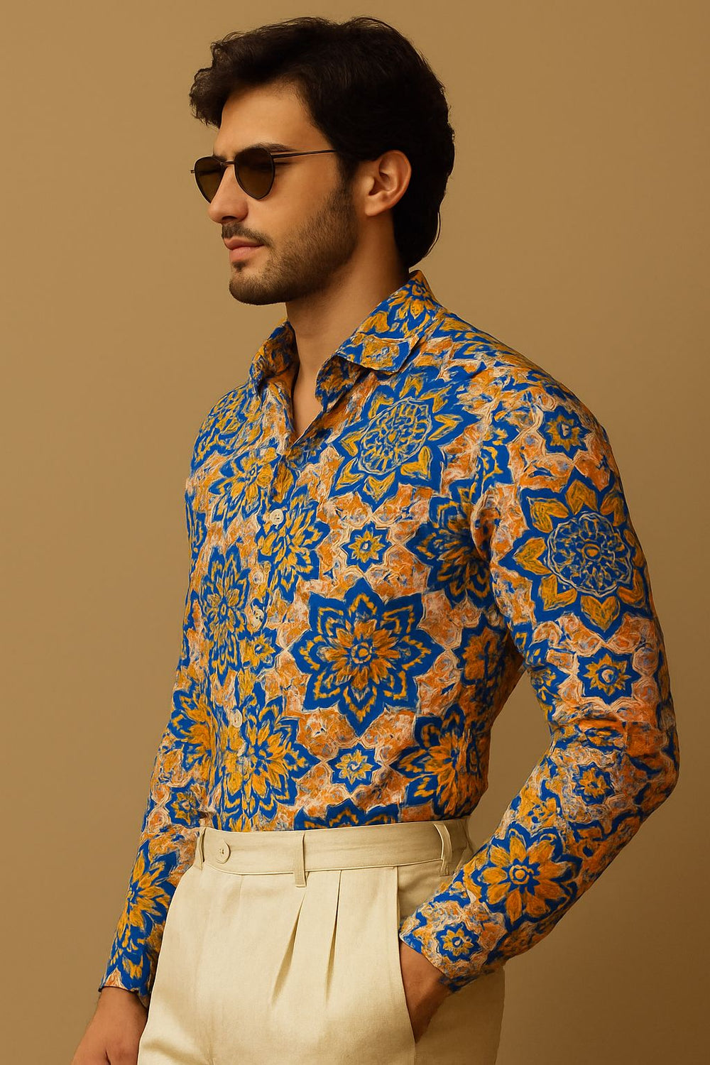 Blue and Beige Moda Full Sleeve Regular Fit Printed Shirt | For Men