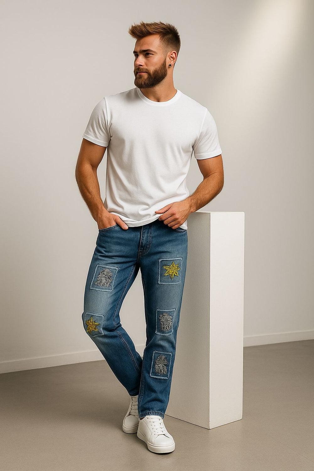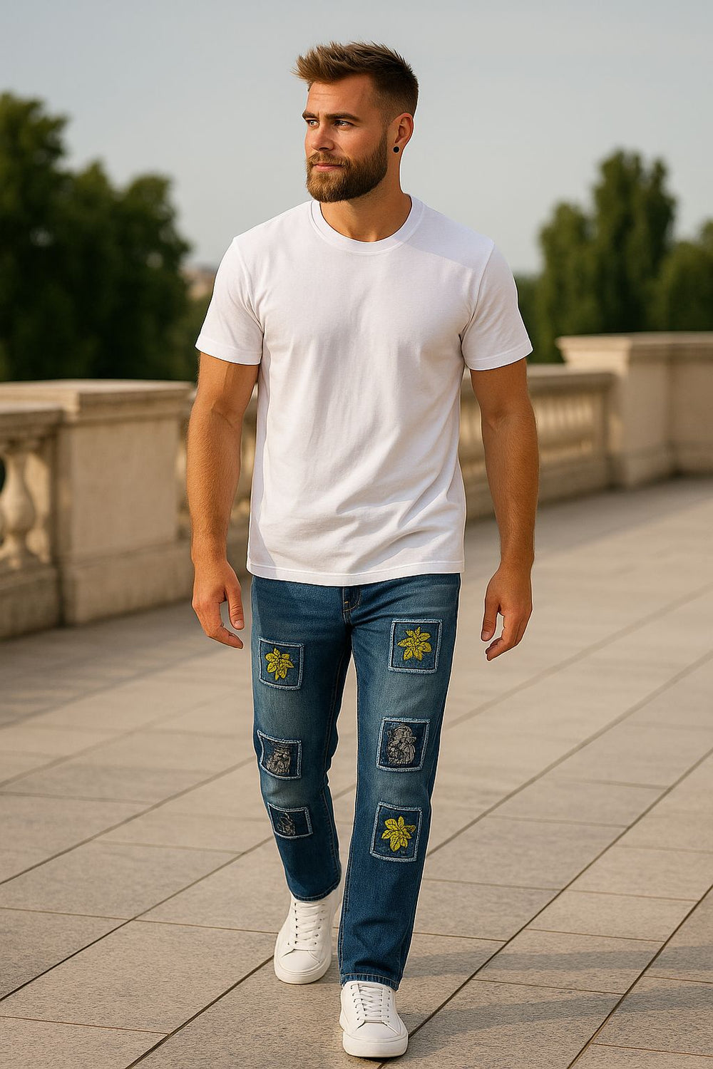 Refresh your wardrobe with these light blue patchwork jeans for men, crafted from premium denim and designed with bold printed graphic panels. Featuring a mix of floral and abstract square patches, these jeans add an artistic and stylish statement to any outfit.