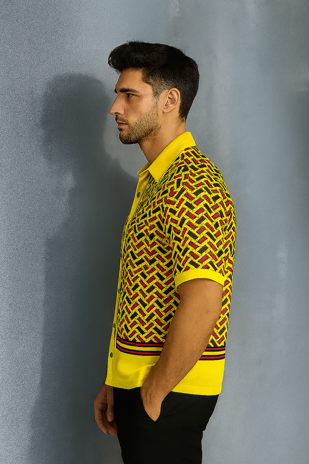 Turn every street into a runway with this eye-catching premium imported shirt, crafted for those who dare to stand out. Drenched in a bold yellow base with a hypnotic magenta-black geometric print, this shirt is the perfect blend of high fashion and vibrant energy.