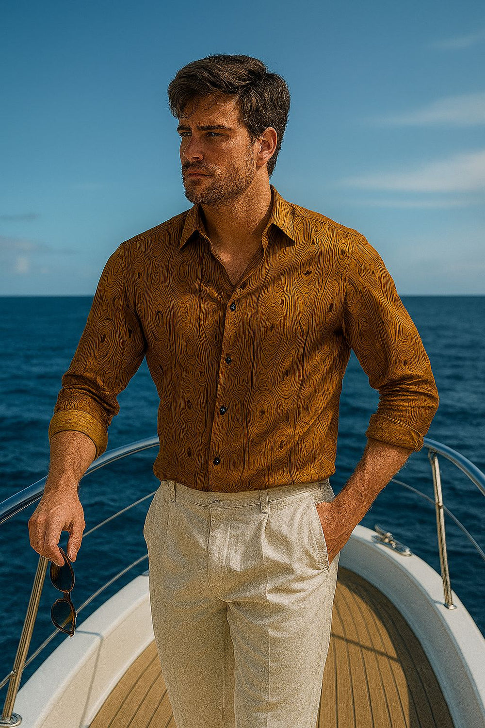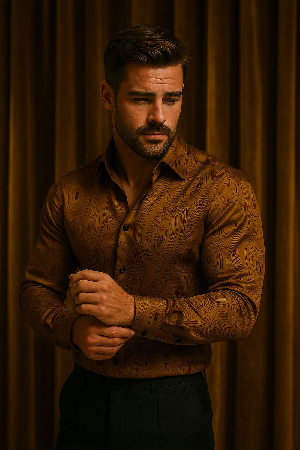 Luxury Golden Brown Satin Shirt for Men – Woodgrain Pattern, Premium Party Wear