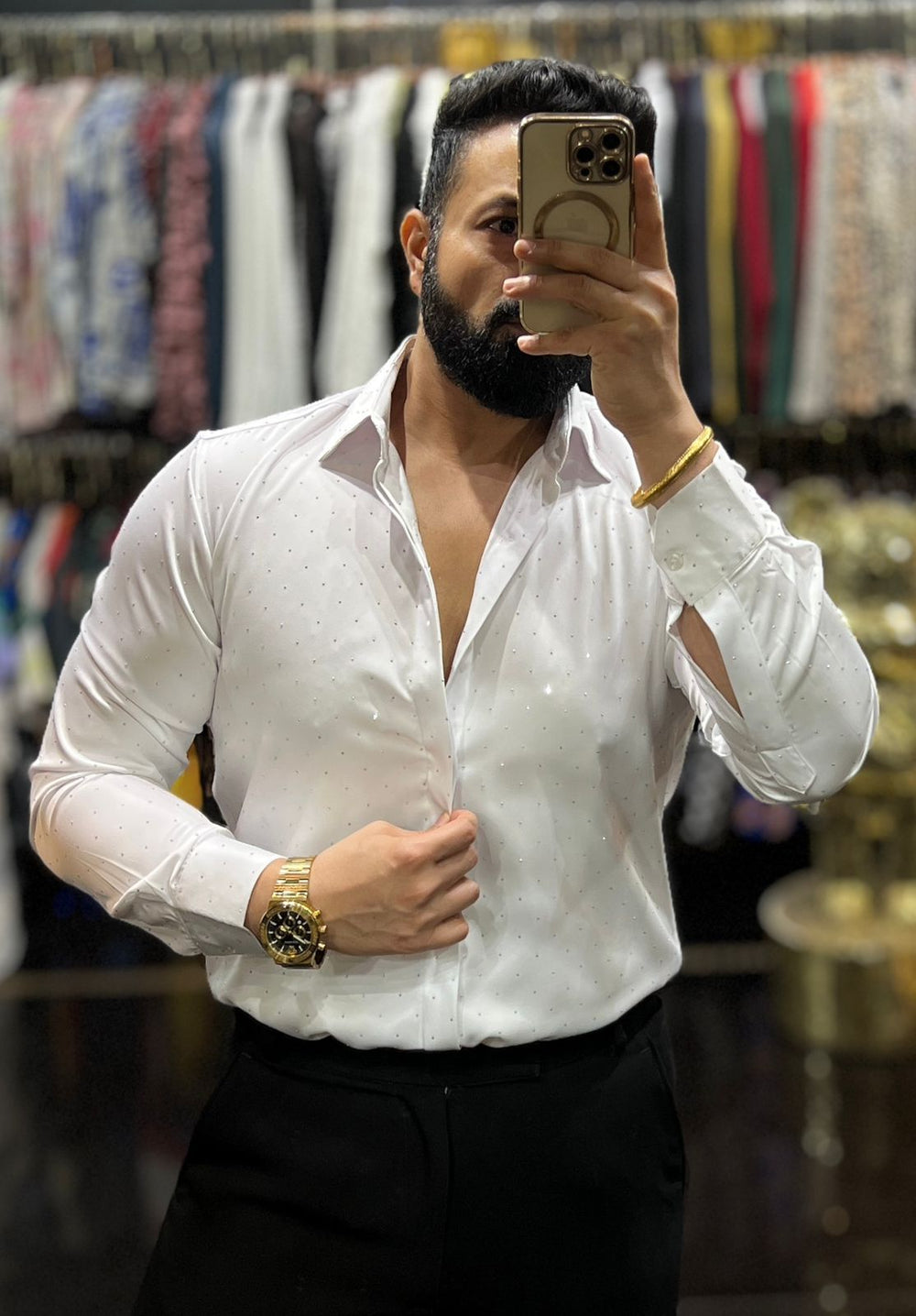 Make a sleek, sophisticated statement with this luxury white crystal-studded shirt, crafted for men who demand elegance with a touch of shine. The premium fabric is soft, comfortable, and tailored to highlight your physique, while the micro crystal detailing adds a subtle, classy sparkle perfect for any high-end occasion.
