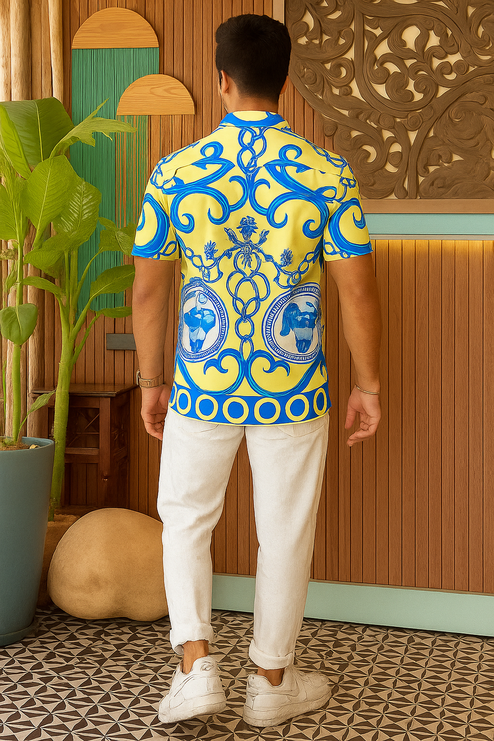 Men’s Premium Chain Print Shirt – Bold Yellow & Blue Half Sleeve Designer Shirt | 21 Inside