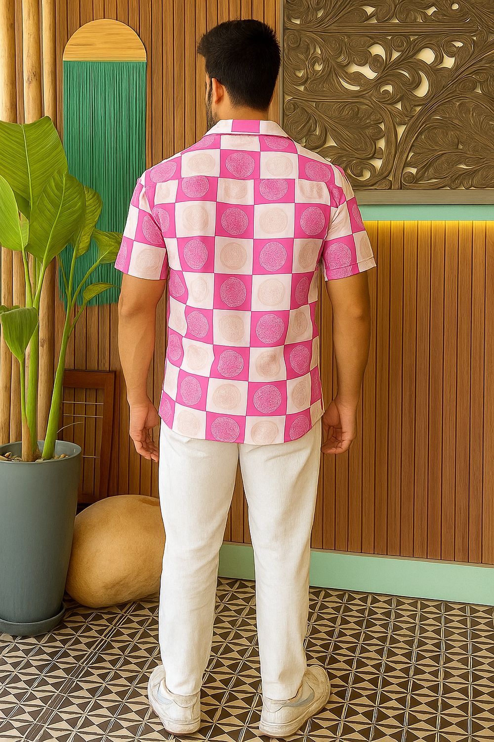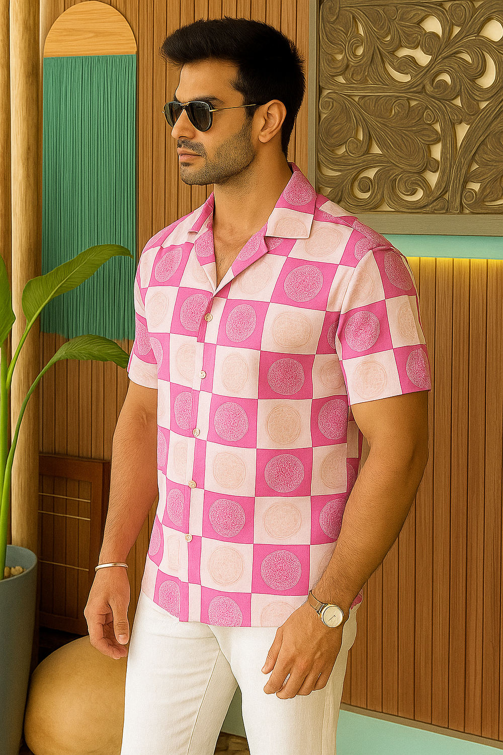 The relaxed yet structured silhouette makes it ideal for pairing with denim, chinos, or linen pants, while the eye-catching pink and white pattern turns heads with every step. Whether you're lounging or stepping out, this shirt brings fresh energy to your wardrobe.