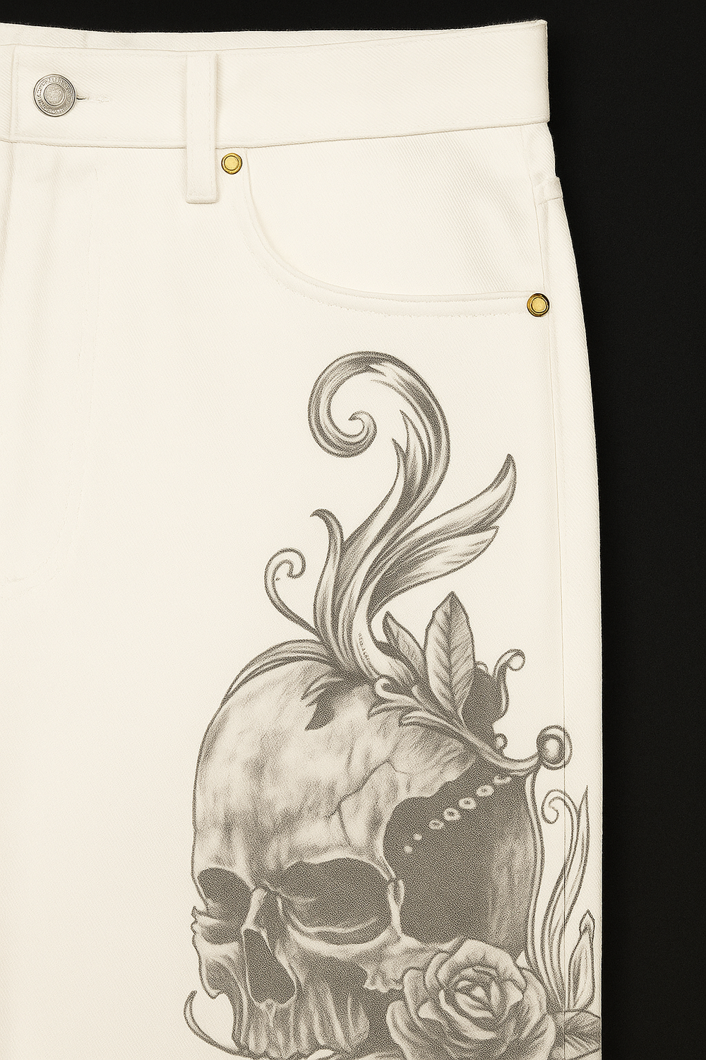 Unleash your edgy side with the Men’s Black Graphic Skull Jeans from 21 Inside – designed for those who make bold fashion statements. Featuring a powerful embroidered skull graphic on one leg, these jeans bring together streetwear attitude and premium craftsmanship.