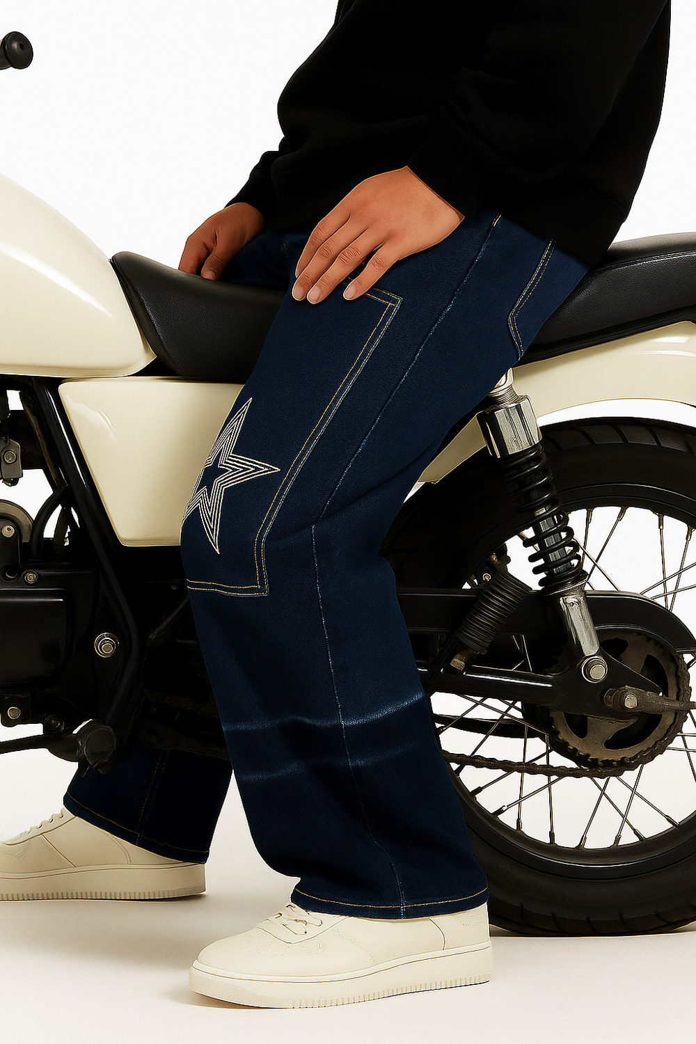 Make a bold streetwear statement with our Men’s Designer Baggy Fit Jeans, featuring standout embroidered star patchwork on the front panels. Crafted from ultra-soft imported lycra denim, these jeans combine premium quality with edgy design for the modern trendsetter.
