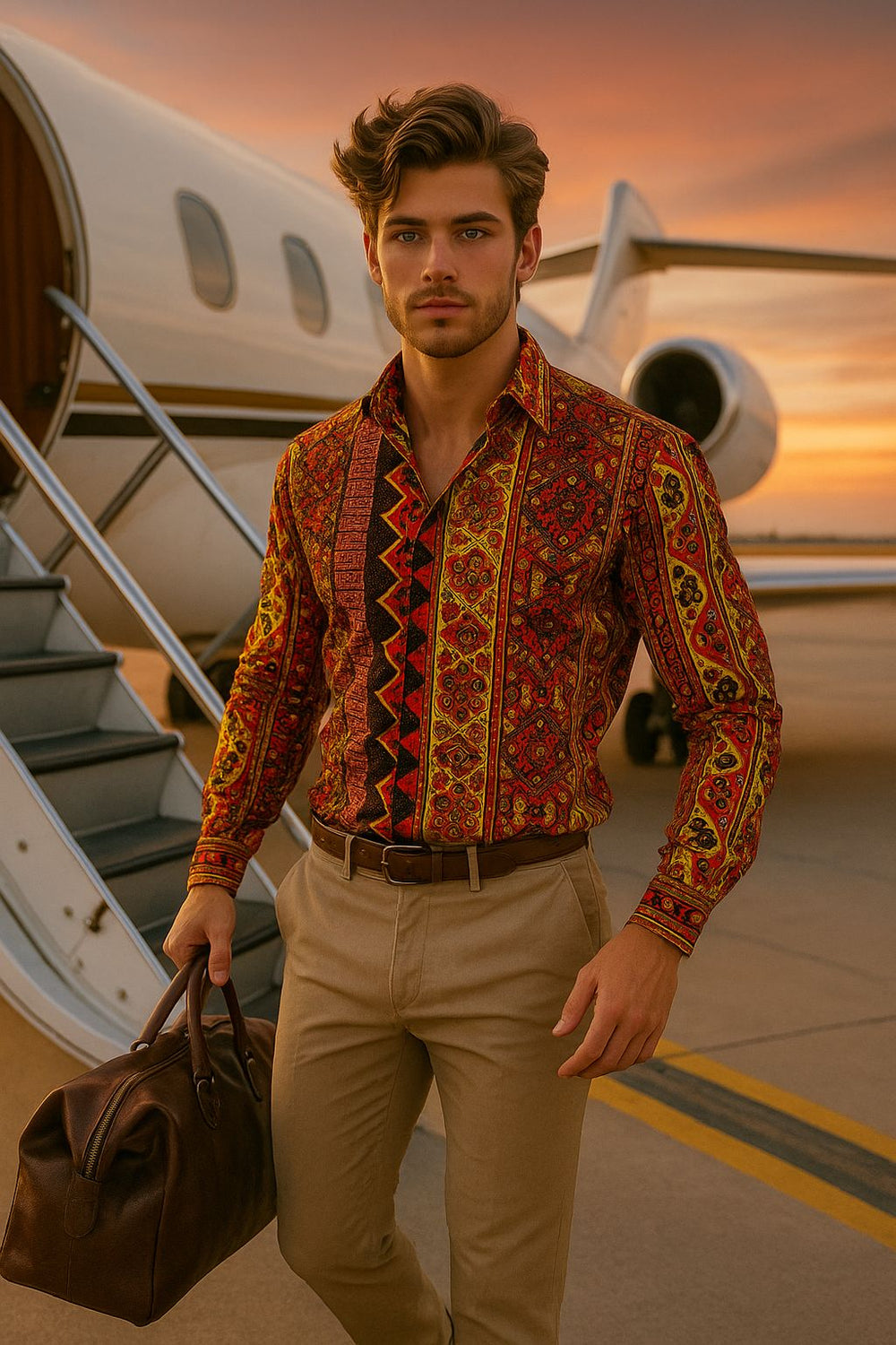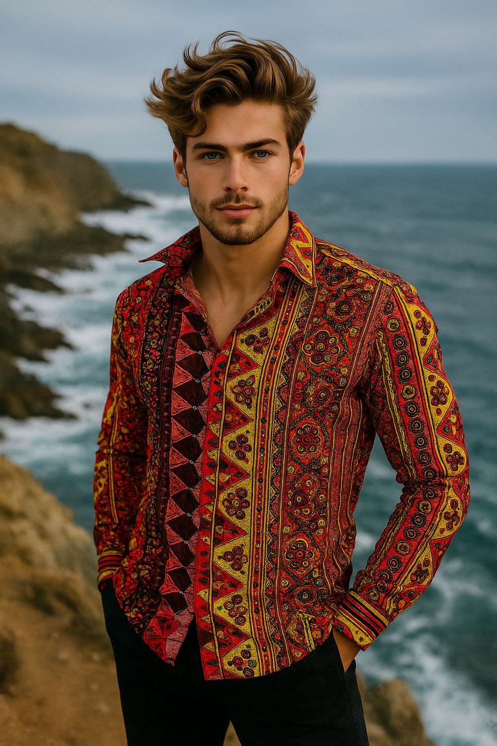 Set your style on fire with this multicolor tribal print shirt for men, designed in a slim fit to make a daring fashion statement. Featuring a striking mix of red, yellow, black, and orange ethnic-inspired patterns, this shirt blends heritage artistry with modern street-style flair.
