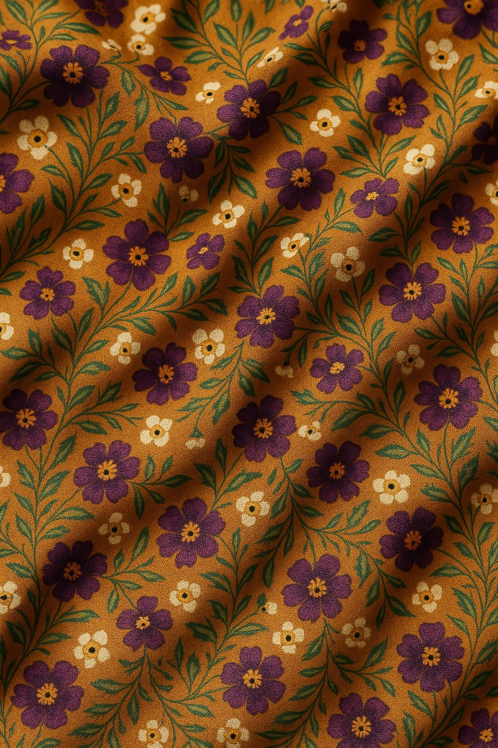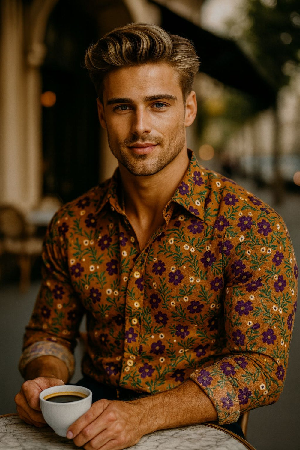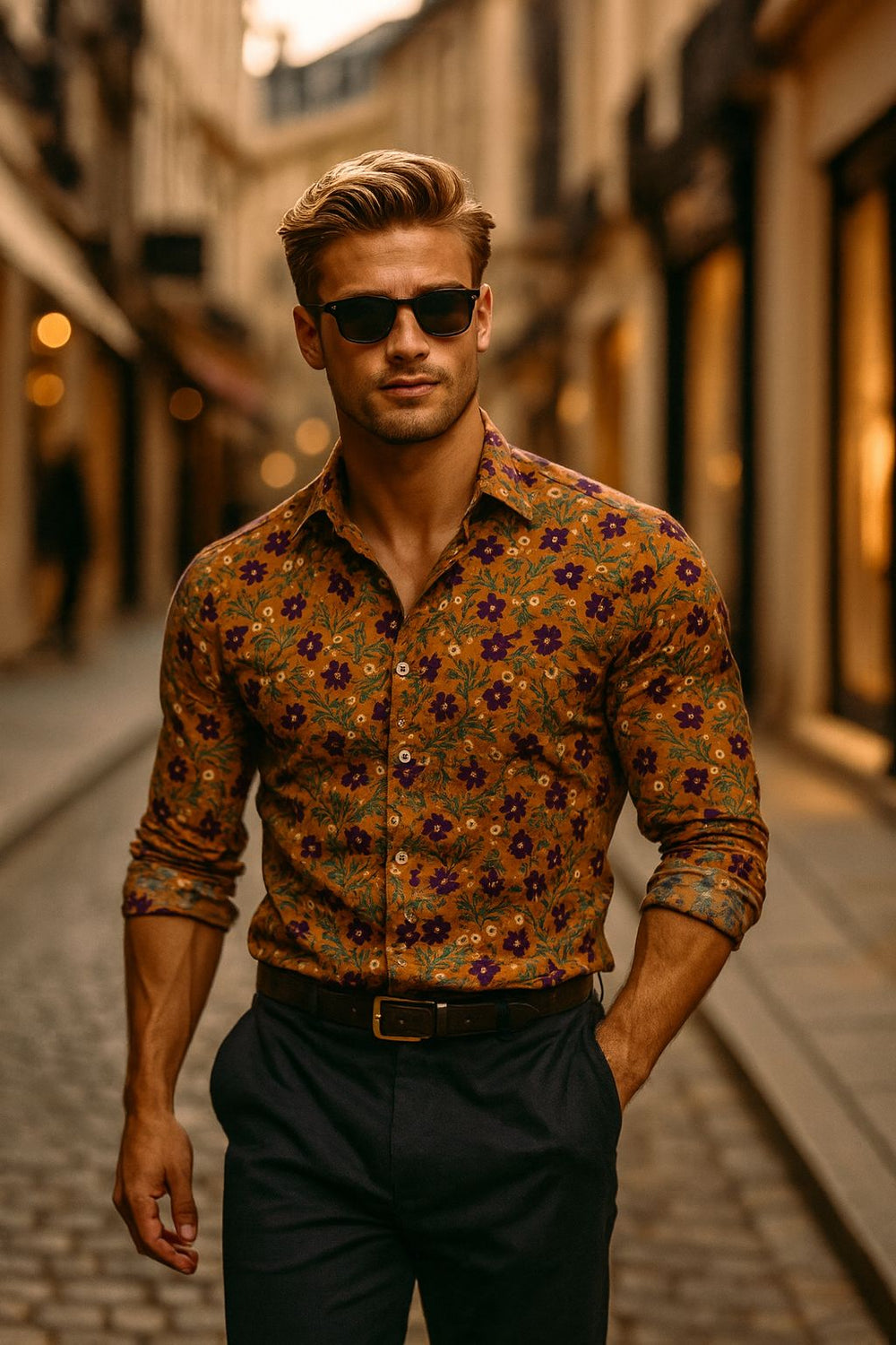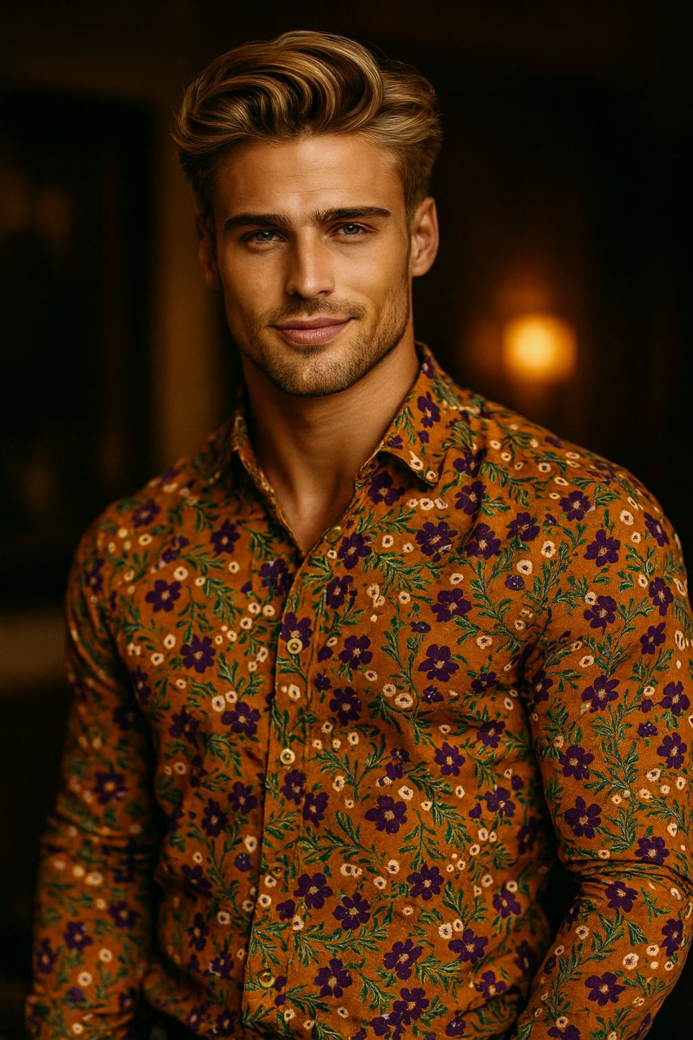 Add a bold twist to your wardrobe with this mustard floral print shirt for men, designed in a slim fit for a modern and confident look. The rich mustard base with purple and green floral detailing creates a vibrant yet classy vibe, making it perfect for parties, date nights, or casual evening outings.