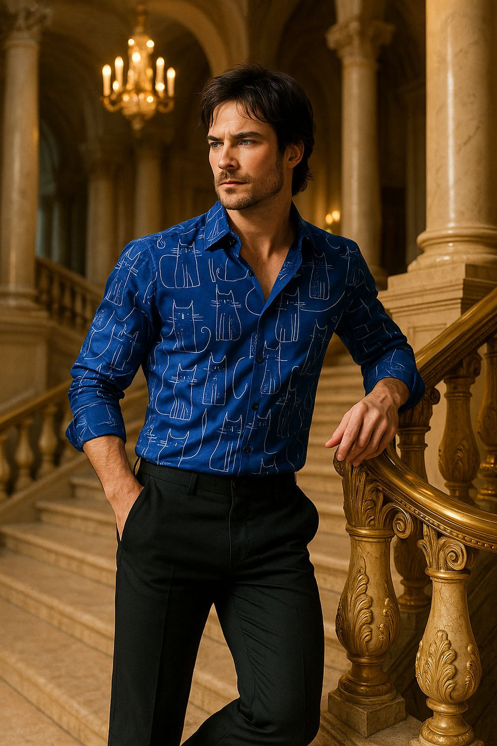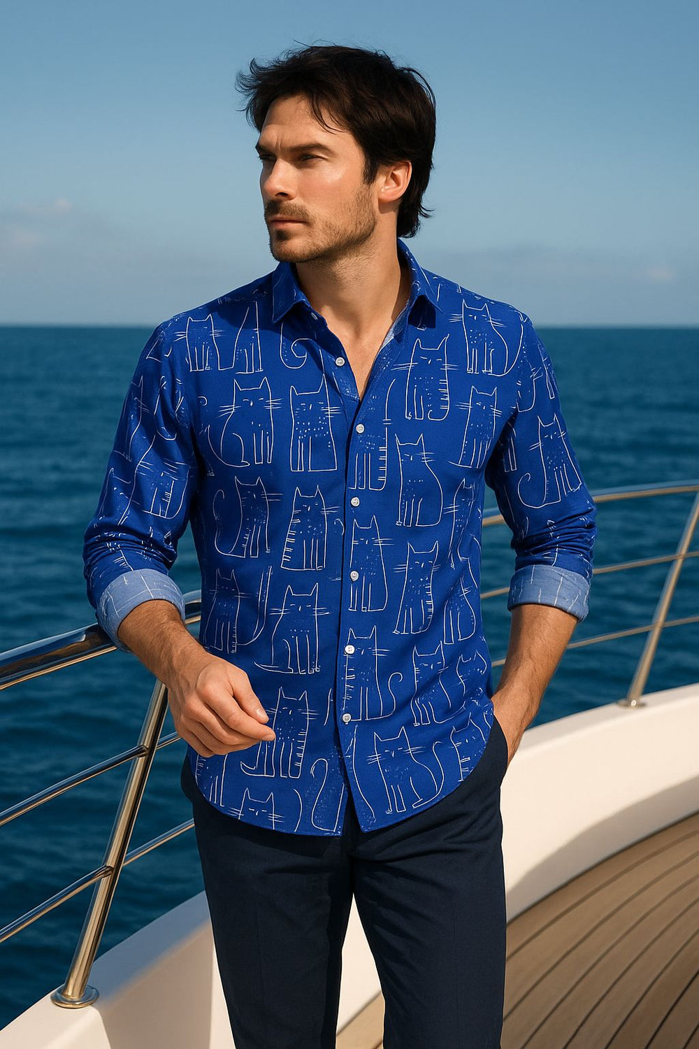 Nautical Blue Men’s Shirt with Abstract Cat Print – Premium Cotton Resort Wear