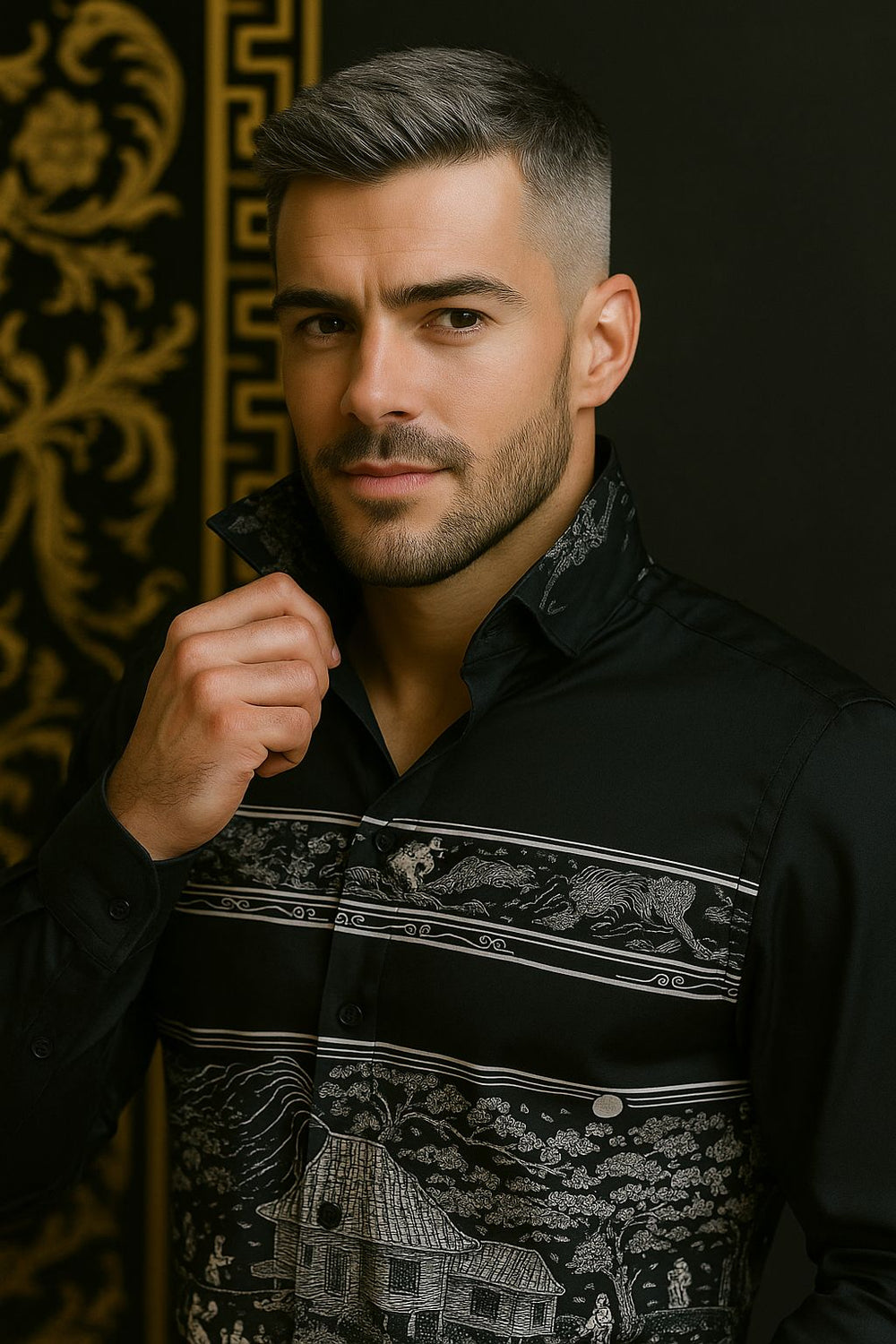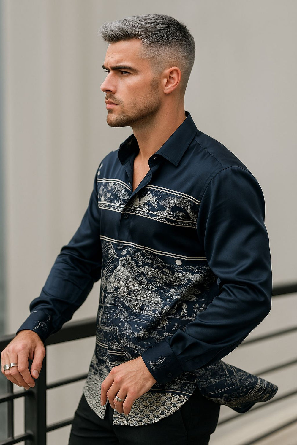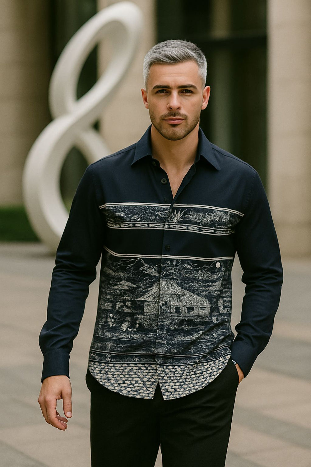 Stand out with timeless elegance in this premium navy blue shirt, featuring an intricate scenic heritage print that showcases artistic countryside visuals. Crafted from high-quality cotton, the shirt offers a structured slim fit with soft comfort and breathability. Ideal for fashion-forward individuals who appreciate storytelling through design, this full-sleeve piece blends classic charm with modern luxury.