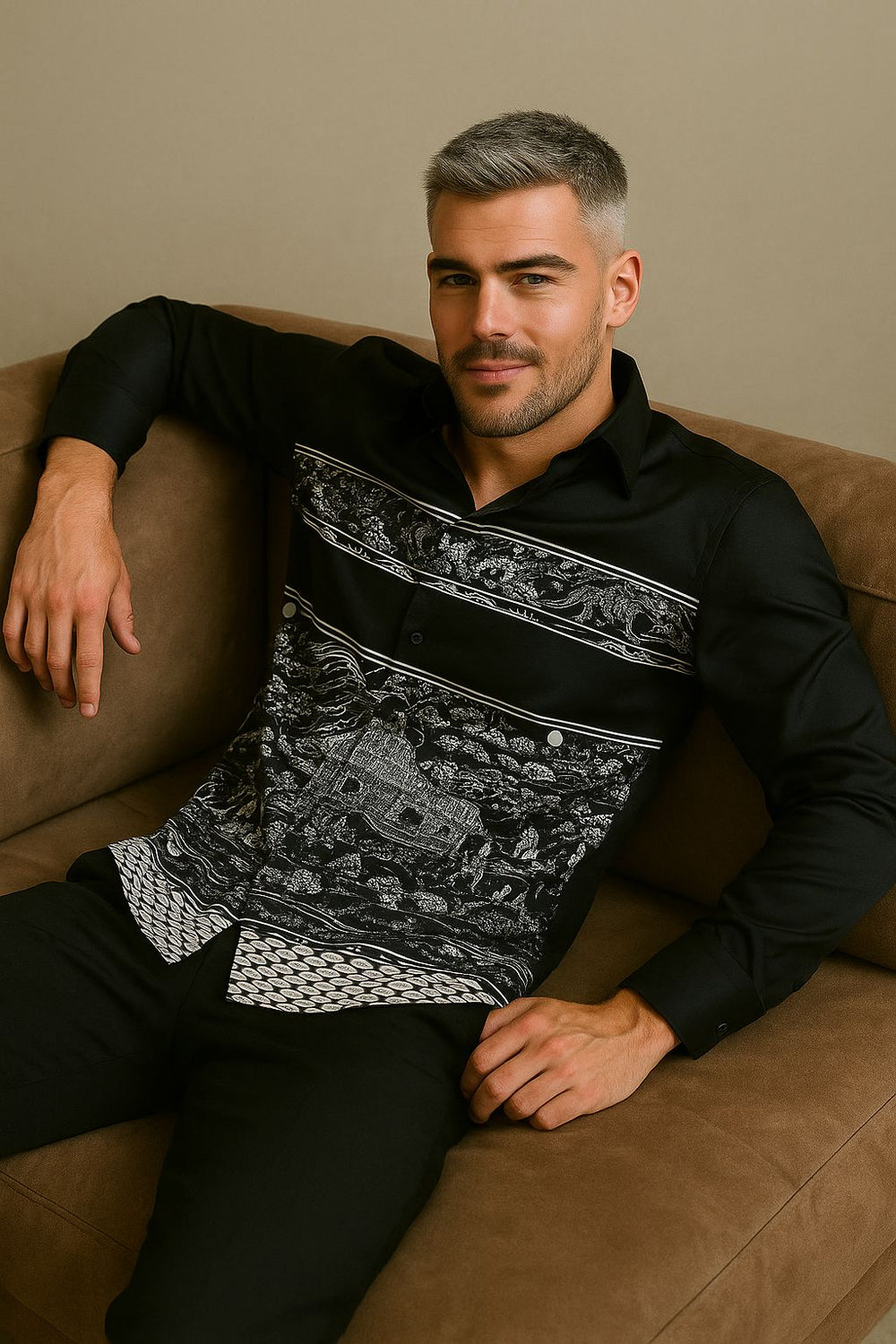 Styling Tip: Pair with solid black trousers and loafers for a museum-ready, upscale smart look