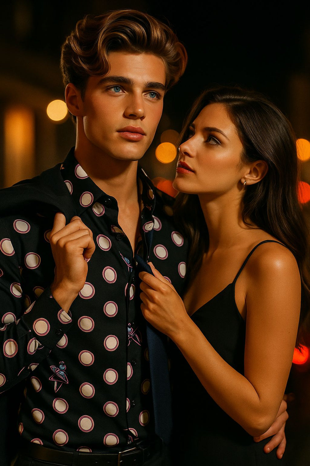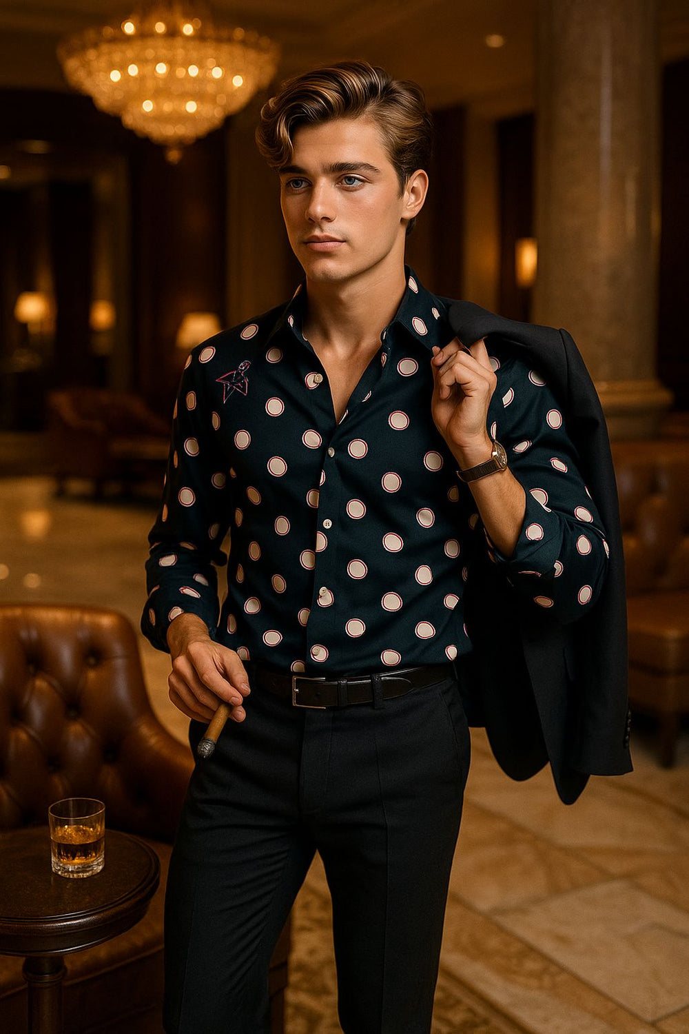 Command attention with this navy blue designer polka dot shirt for men, tailored in a sleek slim fit for a bold yet refined look. Featuring striking white circular dot patterns with subtle embroidered accents, this luxury-inspired shirt is perfect for high-end parties, evening events, and fashionable get-togethers. The smooth, premium-quality fabric ensures both comfort and sophistication, making it an essential statement piece in any modern wardrobe.