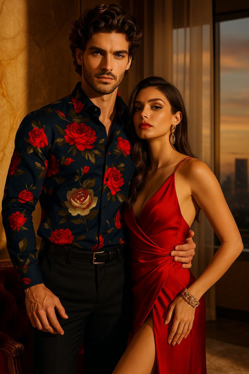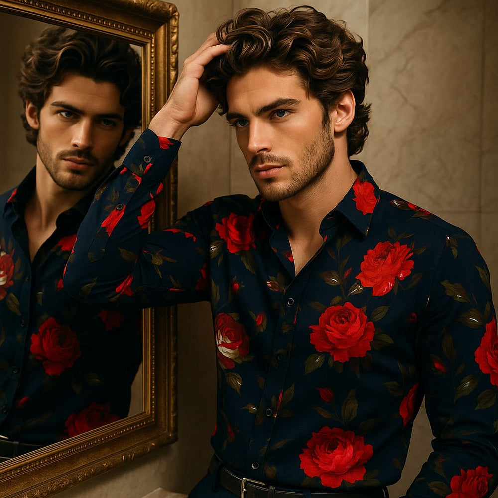 Steal the spotlight with this navy blue rose print shirt for men, designed in a sleek slim fit for a bold yet elegant look. The rich navy base paired with striking red rose motifs creates a powerful statement of luxury and passion. Perfect for parties, date nights, and high-fashion evenings, this shirt blends modern sophistication with timeless romance.