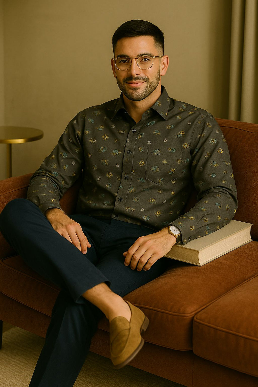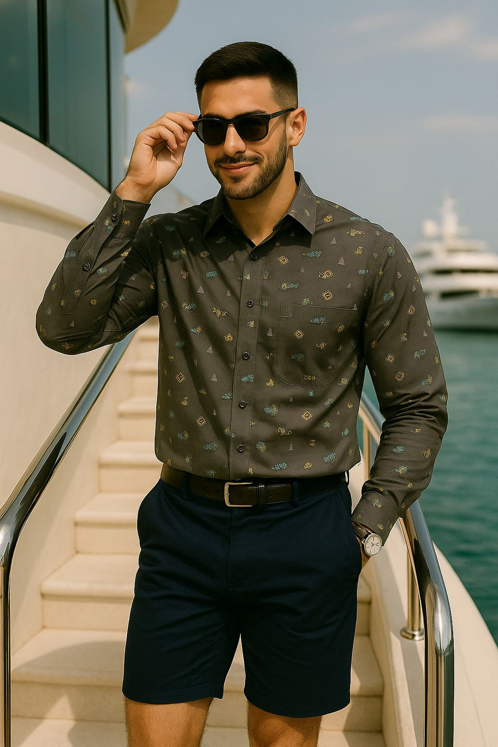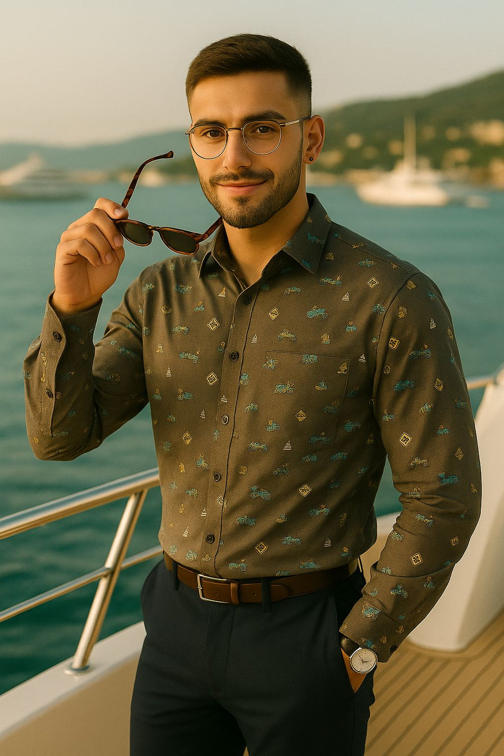 Add a refined twist to your wardrobe with our Olive Green Printed Men’s Shirt, tailored from premium breathable cotton for all-day comfort. Featuring a tasteful mix of minimal geometric and abstract motifs in subtle yellow, blue, and grey tones, this shirt strikes the perfect balance between modern sophistication and everyday wearability. Its smart fit and versatile color make it ideal for office meetings, evening gatherings, or casual weekend outings.