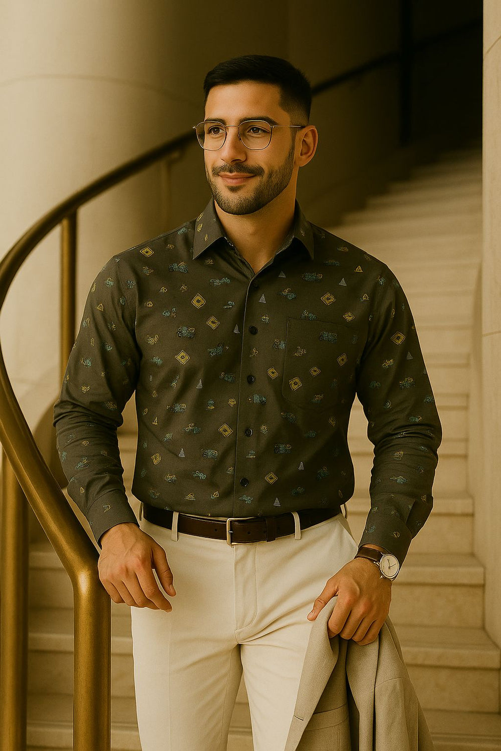 Olive Green Printed Men’s Shirt – Premium Cotton with Minimal Geometric Motifs