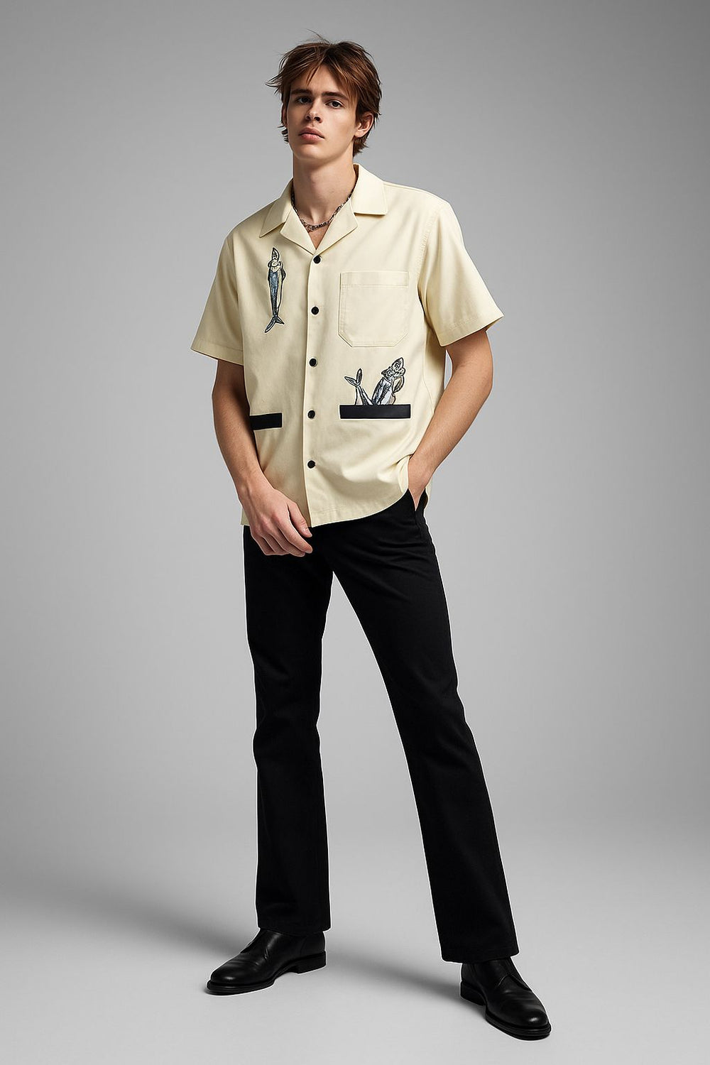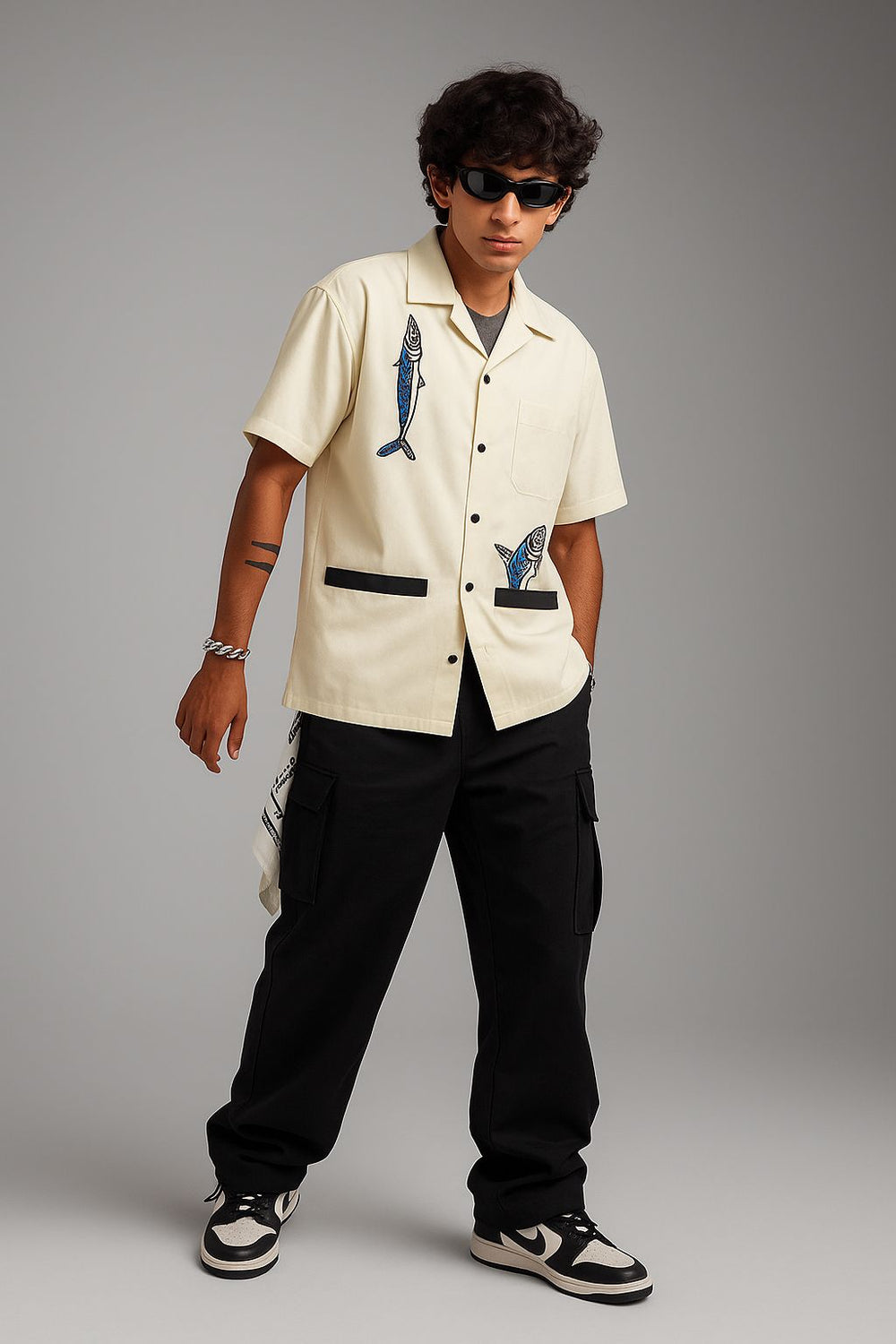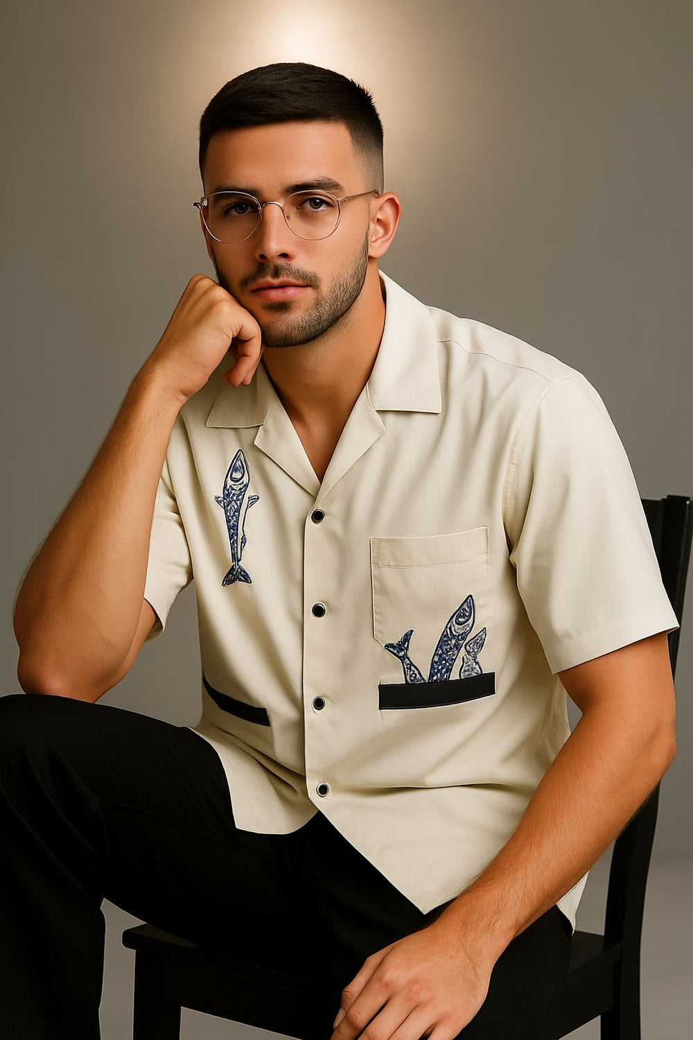 Color: Elegant beige with exclusive fish embroidery on the chest and pocket
