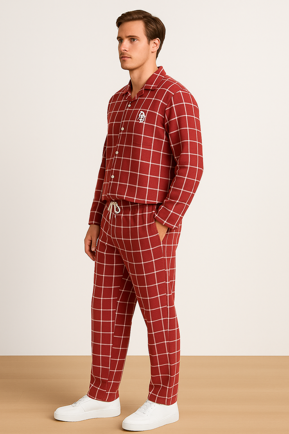 Red Checked Co-ord Set for Men β Baggy Fit | 4-Way Lycra Fabric | Drop Shoulder Full Sleeve Shirt & Pants