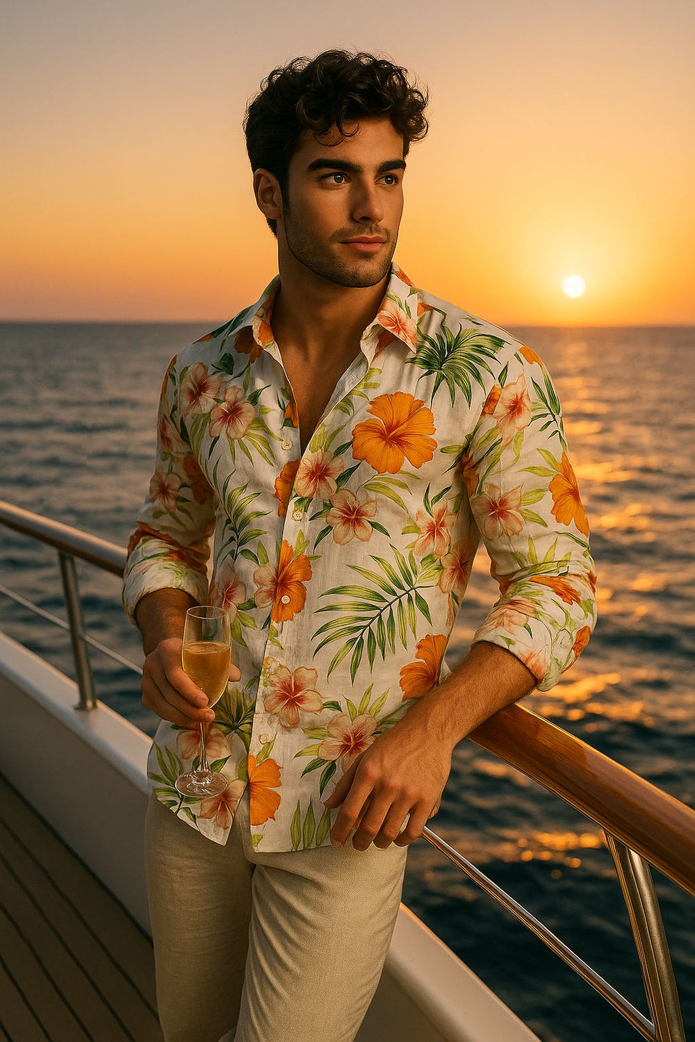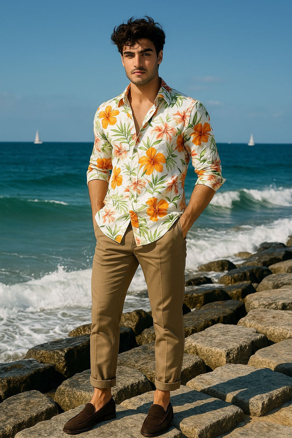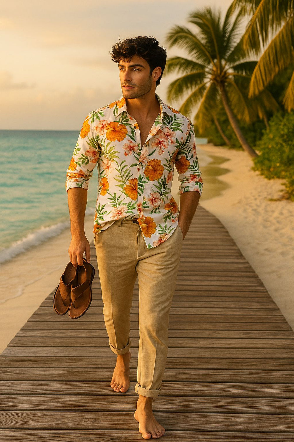 Bring the vacation vibes wherever you go with our Tropical Beach Floral Men’s Shirt. Crafted from lightweight premium cotton, this shirt showcases a vibrant orange and yellow hibiscus floral print with lush green leaves on a crisp white base. Designed for comfort and style, it’s the perfect choice for beach parties, summer getaways, tropical holidays, and resort evenings. The relaxed yet tailored fit ensures you look effortlessly stylish whether you’re strolling along the shoreline or sipping cocktails at sunset.