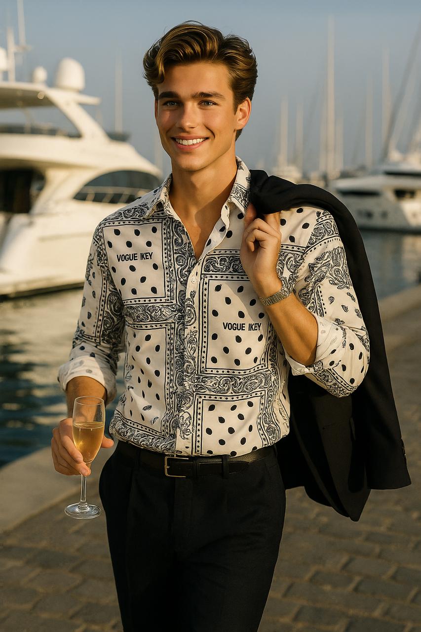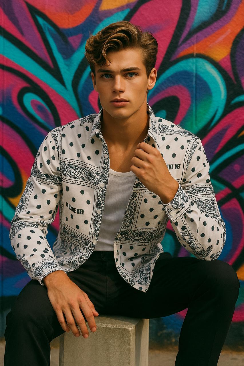 Redefine elegance with this white paisley print slim fit shirt for men, designed for those who love making a classy statement. Featuring black paisley patterns and dotted accents on a crisp white base, this shirt blends heritage-inspired design with modern luxury styling. Perfect for evening parties, date nights, and high-fashion occasions, it adds an instant touch of sophistication to your wardrobe.